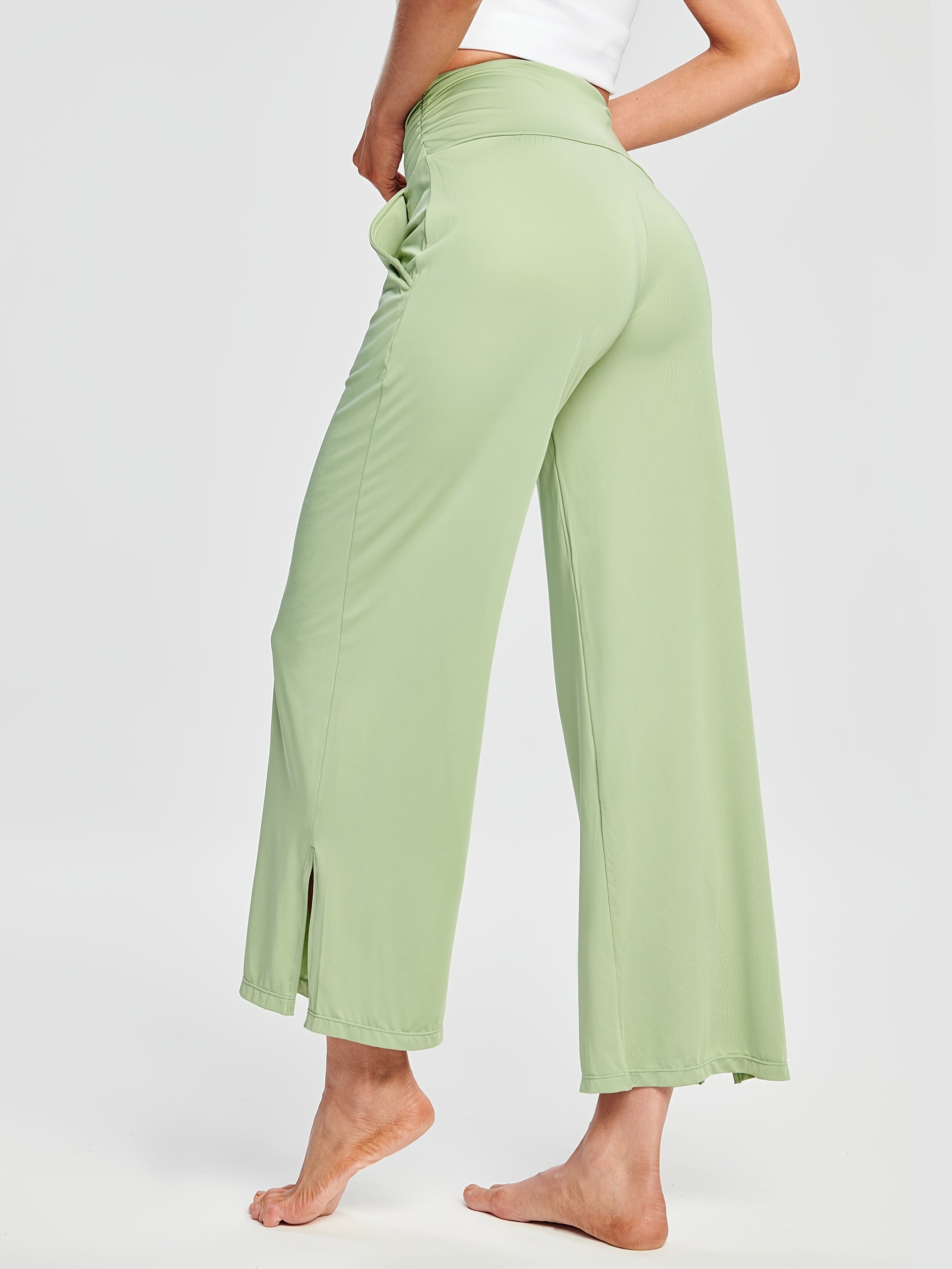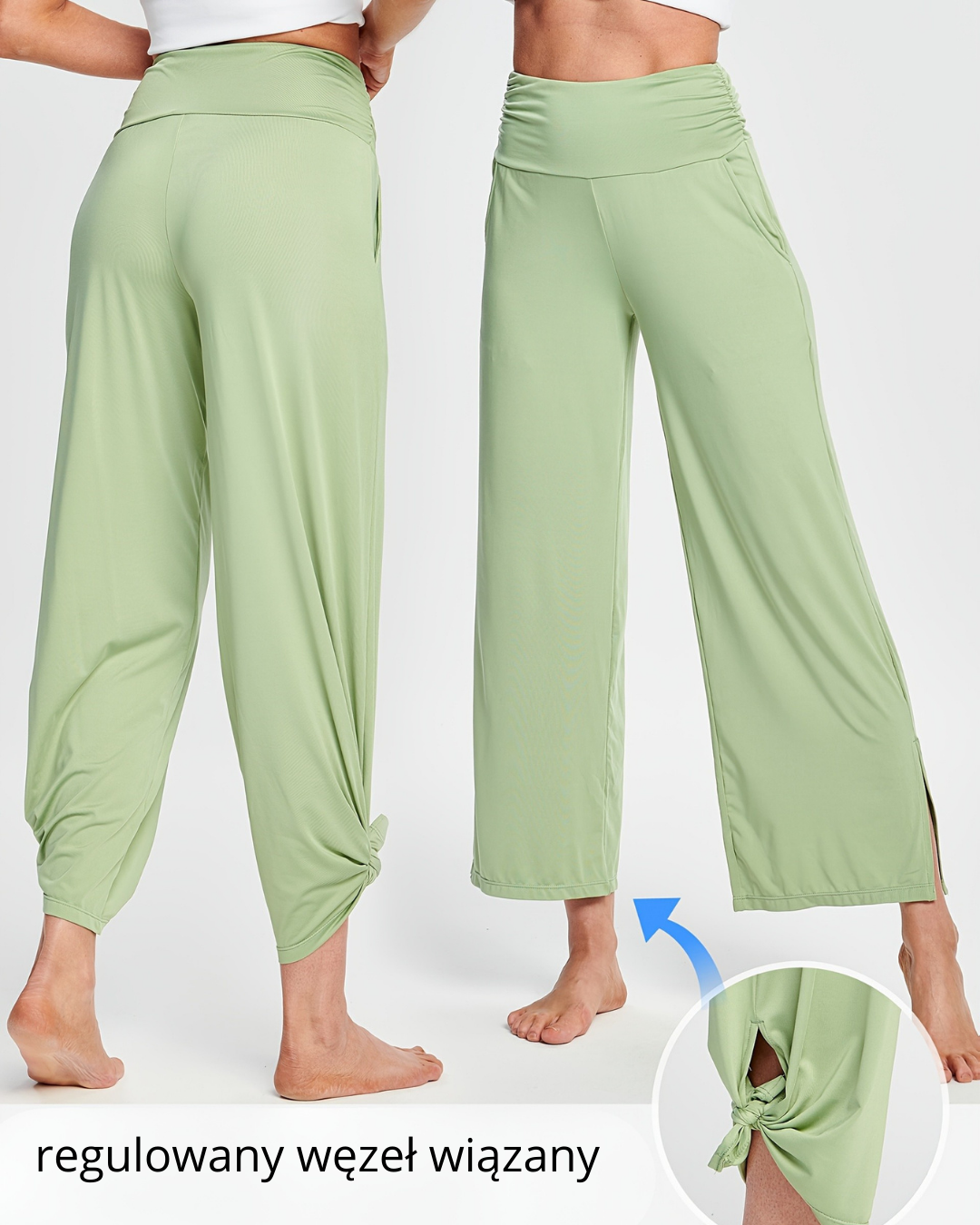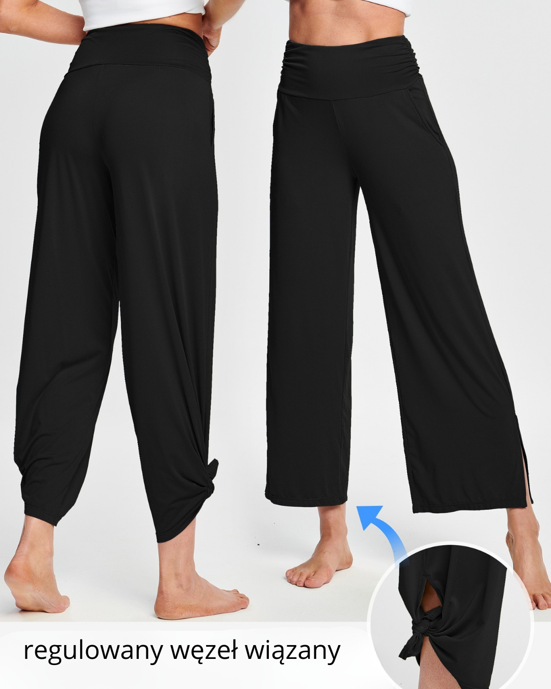 Wygodne spodnie do jogi z szerokimi nogawkami i rozcięciem dla pełnej swobody ruchu.