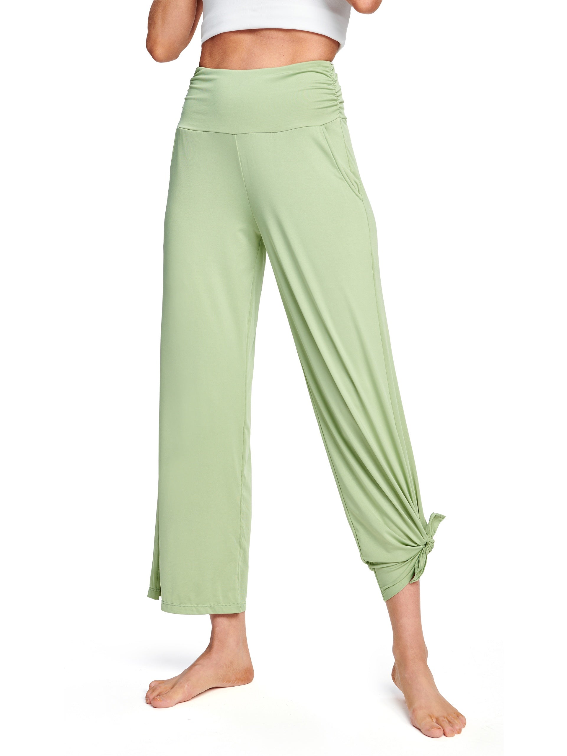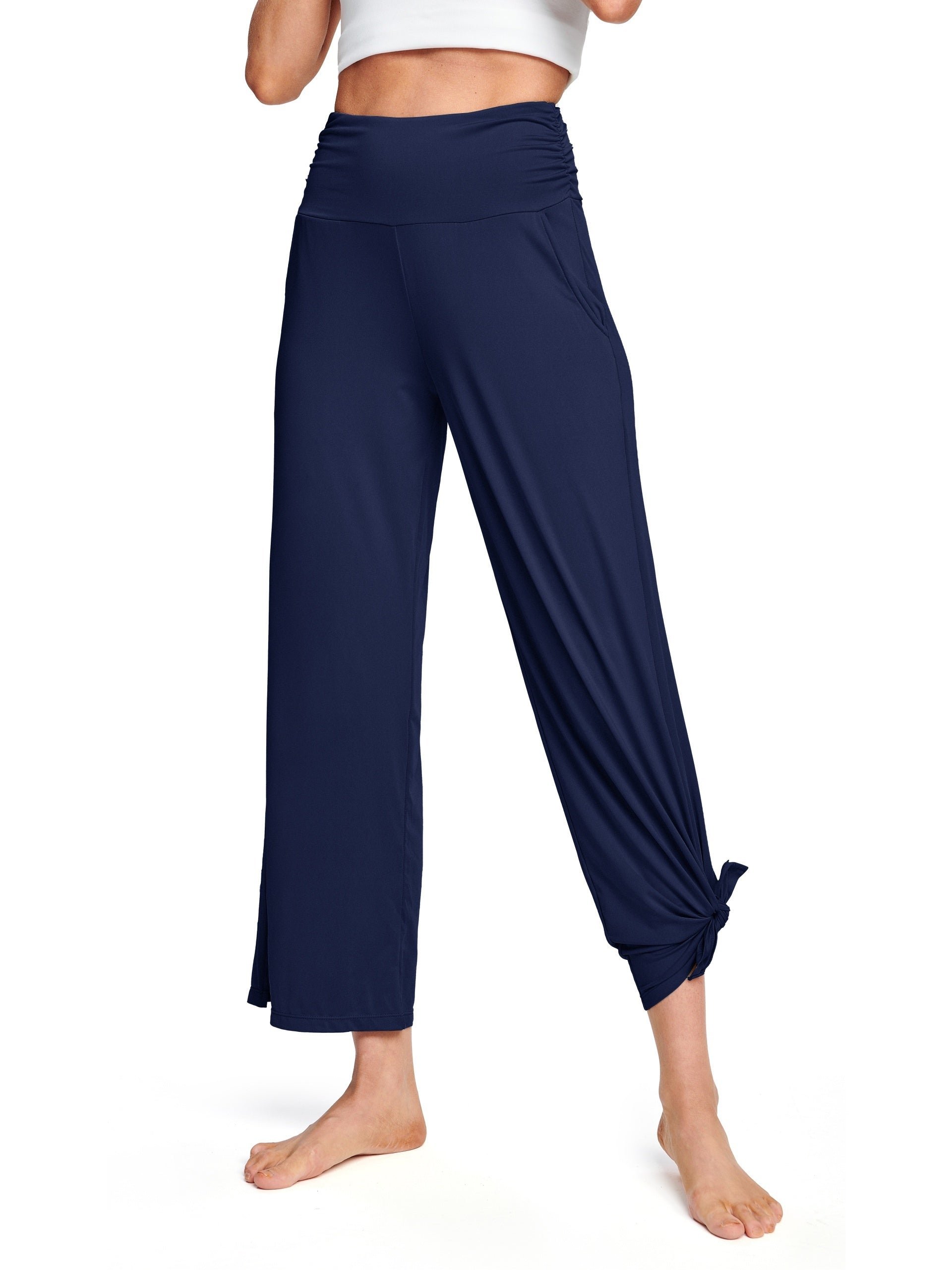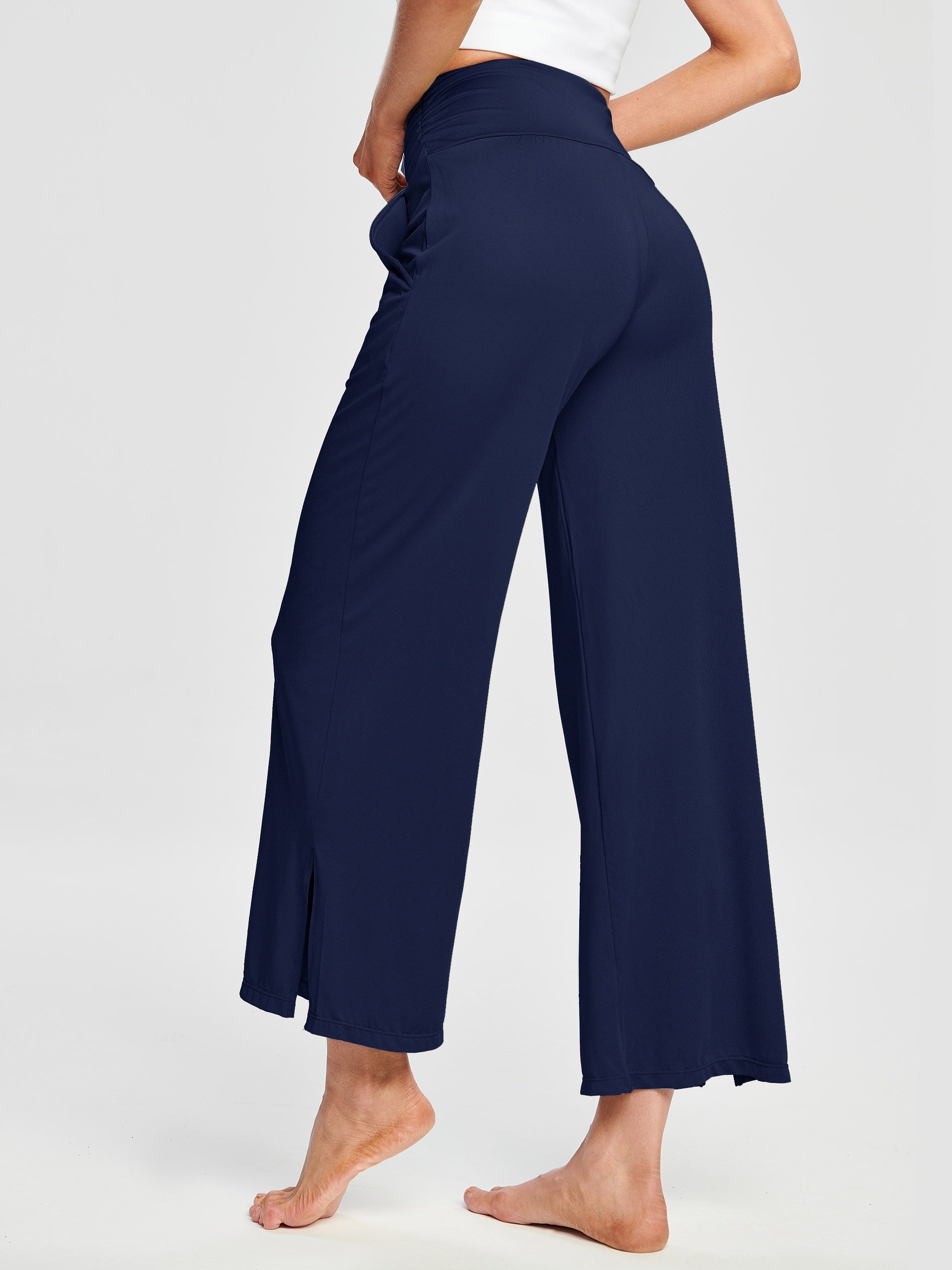 Wygodne spodnie do jogi z szerokimi nogawkami i rozcięciem dla pełnej swobody ruchu.