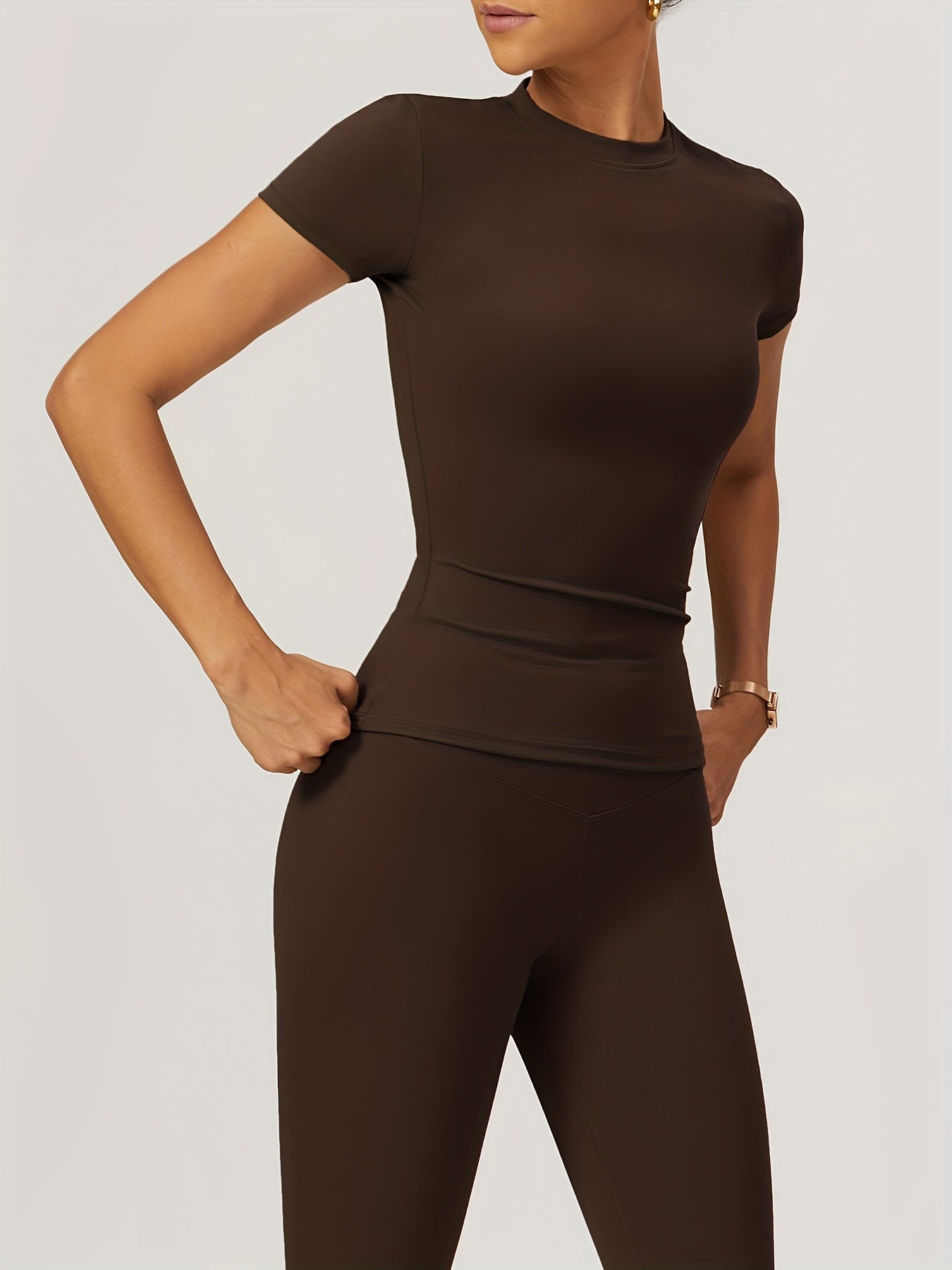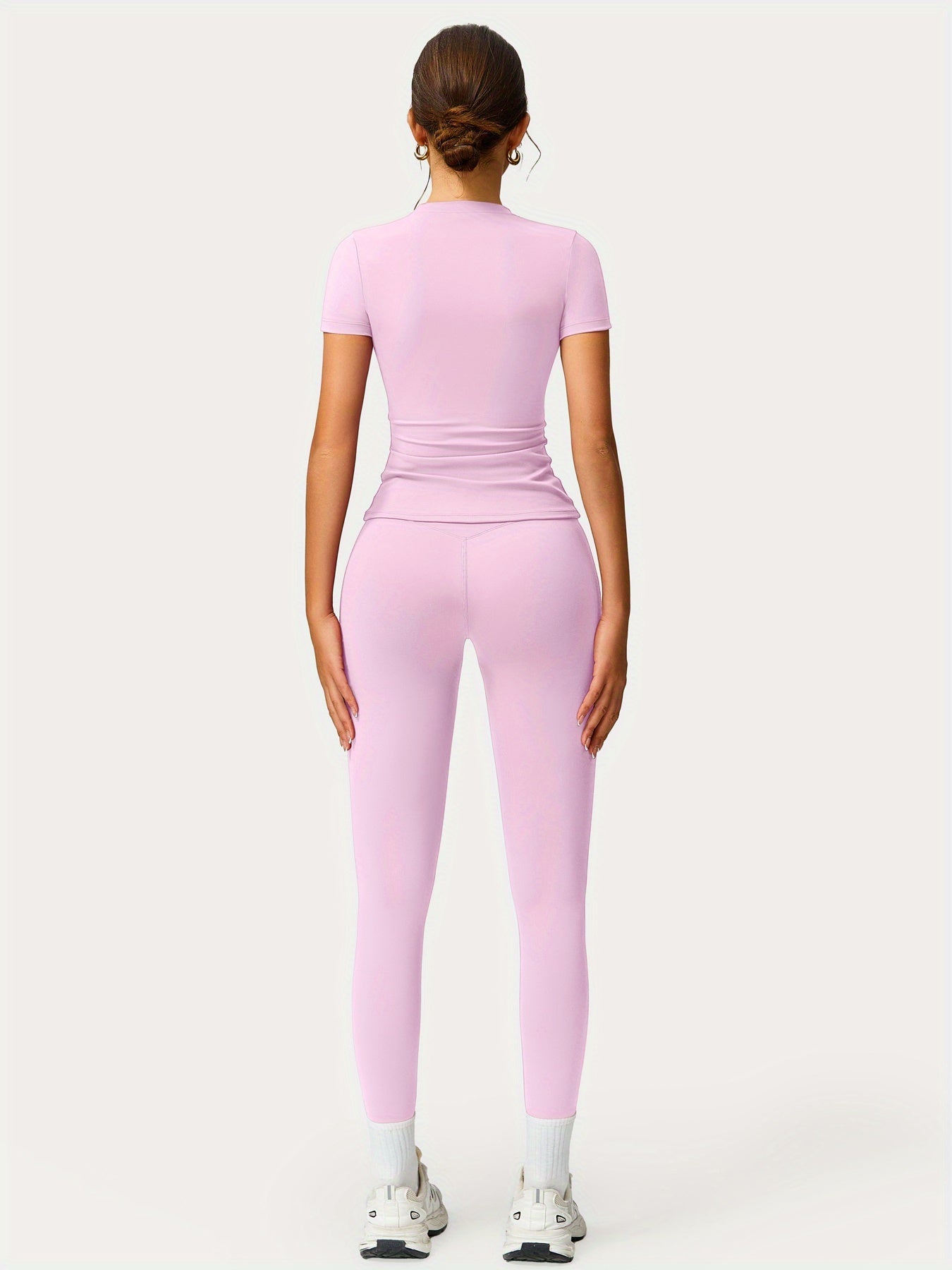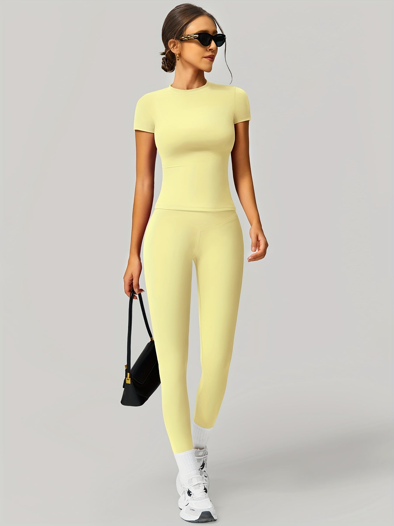 En damski komplet sportowy został zaprojektowany z myślą o aktywnym stylu życia. Wysokoelastyczna, dzianinowa tkanina dobrze dopasowuje się do sylwetki, szybko schnie i zapewnia komfort podczas treningu. Zestaw składa się z koszulki sportowej z krótkim rękawem oraz dopasowanych spodni w jednolitym kolorze.